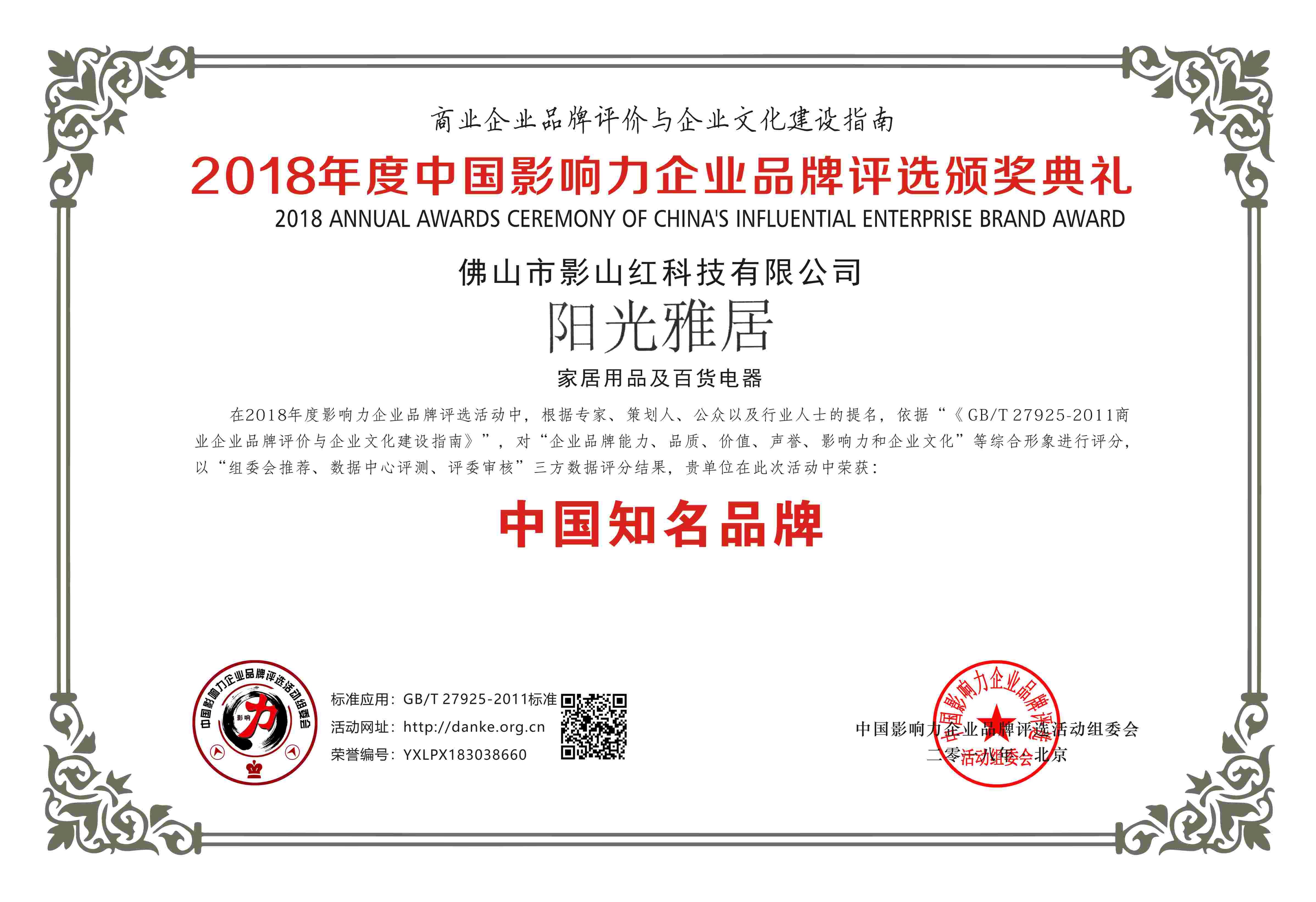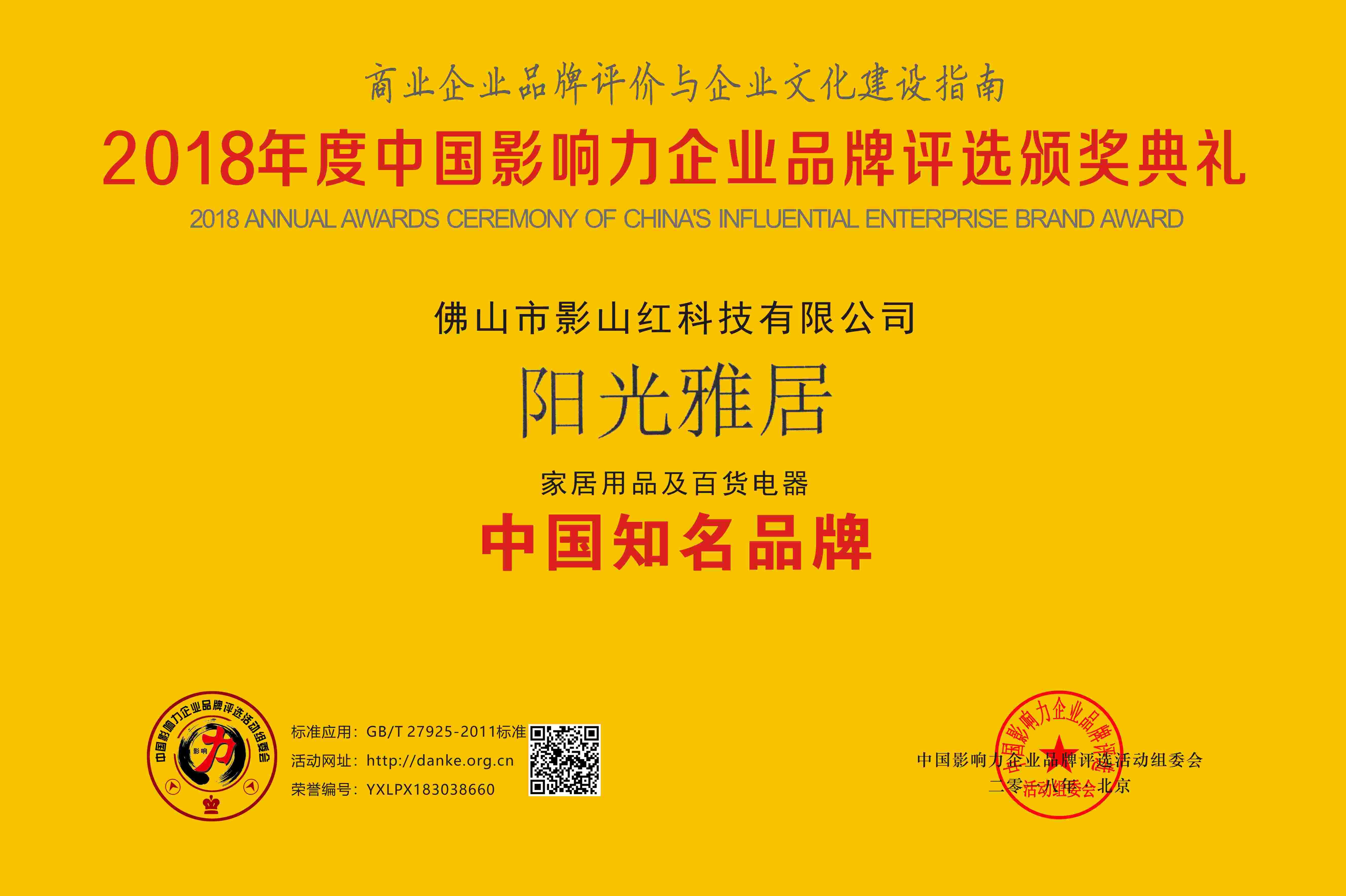 恭喜陽光雅居電動晾衣架,佛山影山紅科技有限公司榮獲2018年度中國影響力企業(yè)品牌評選頒獎典禮入選中國知名品牌。