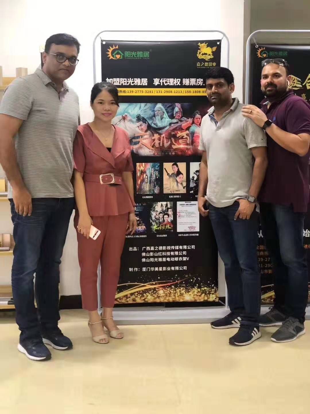 佛山市影山紅科技有限公司,7月22日迎來了來自印度的朋友們,感謝他們對我們陽光雅居智能電動晾衣機和電影《中華武魂》的支持與青睞,感謝他們的加盟,有他們的支持使用我們陽光雅居電動晾衣架走向世界各地。歡迎國內外朋友來加盟代理陽光雅居電動晾衣架,歡迎來電咨詢,加盟熱線15818088571、13129081213。