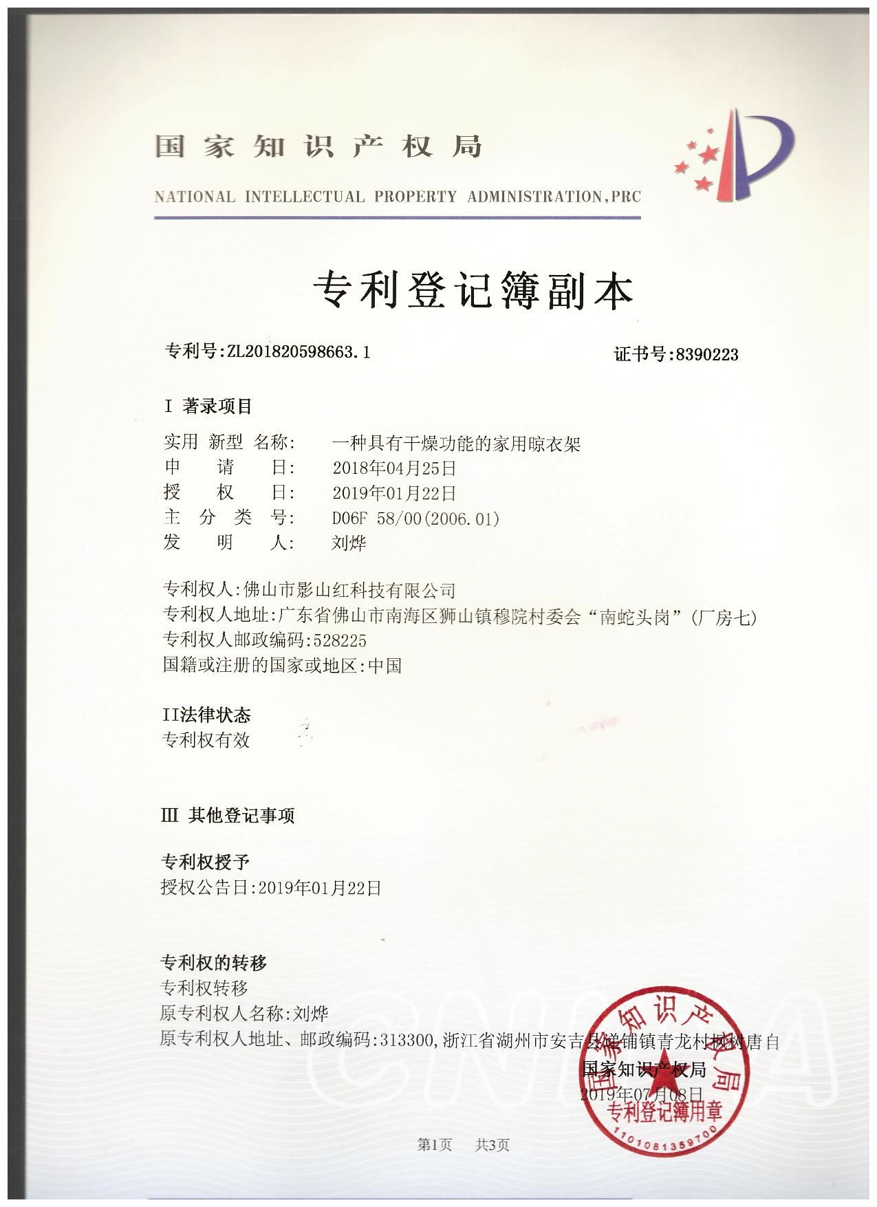 廣東電動晾衣架廠 佛山電動晾衣架廠 陽光雅居智能電動晾衣架廠 佛山市影山紅科技有限公司 經過技術工程師團隊的研發和突破,成功申請并榮獲國家知識產權局頒發的《一種具有干燥功能的家用晾衣架》專利,這是國家知識產權局對我們佛山市影山紅科技有限公司陽光雅居智能電動晾衣架廠生產智能電動晾衣機技術的認可與肯定,這也給了我們技術工程師團隊非常大的鼓舞,我們的技術工程師團隊也會不斷努力研發創新,生產出更智能、方便、安全的晾衣機,給客戶更好的晾衣體驗。歡迎國內外朋友來加盟代理陽光雅居電動晾衣架,歡迎來電咨詢,加盟熱線15818088571、13129081213。